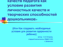 Цель деятельности педагога – создание педагогических условий для развития творчества (творческих способностей, одаренностей) дошкольников. - создание предметно-развивающей среды как одного из основных средств развития творческо-познавательной активности детей; обогащение педагогического процесса современными здоровьесберегающими и образовательными технологиями (проектные методы, экспериментирование, модульный принцип, событийные