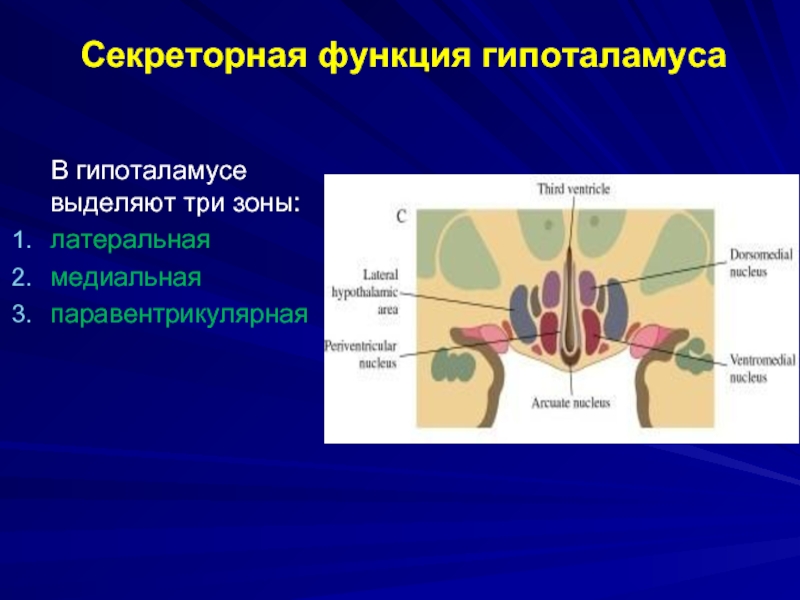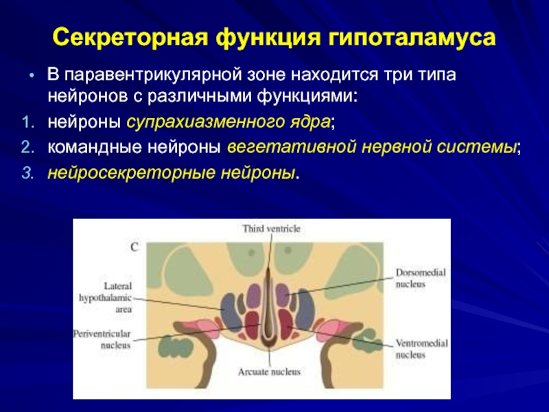 Слайд 3Секреторная функция гипоталамуса