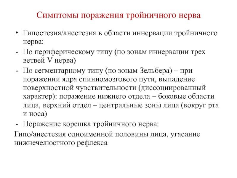 По сегментарному типу (по зонам Зельбера) – при поражении ядра спинномозгового пути, выпадение поверхностной чувствительности (диссоциированный характер): поражение нижнего отдела – боковые области лица, верхний отдел – центральные зоны лица (вокруг рта и носа)