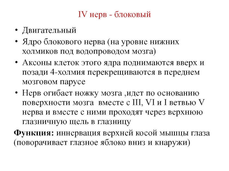 Функция: иннервация верхней косой мышцы глаза (поворачивает глазное яблоко вниз и кнаружи)