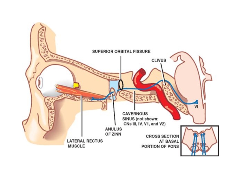 Далее волокна по основанию мозга ,через верхнюю глазничную щель попадает в глазницу
