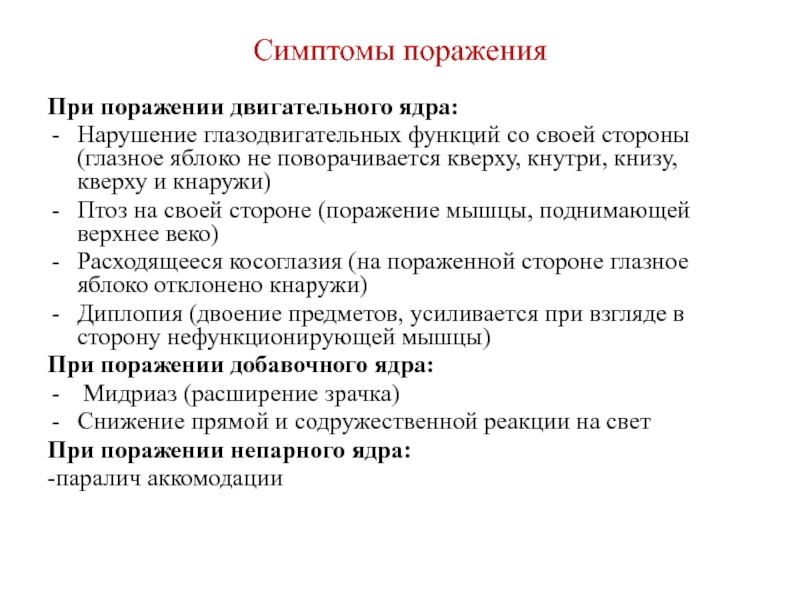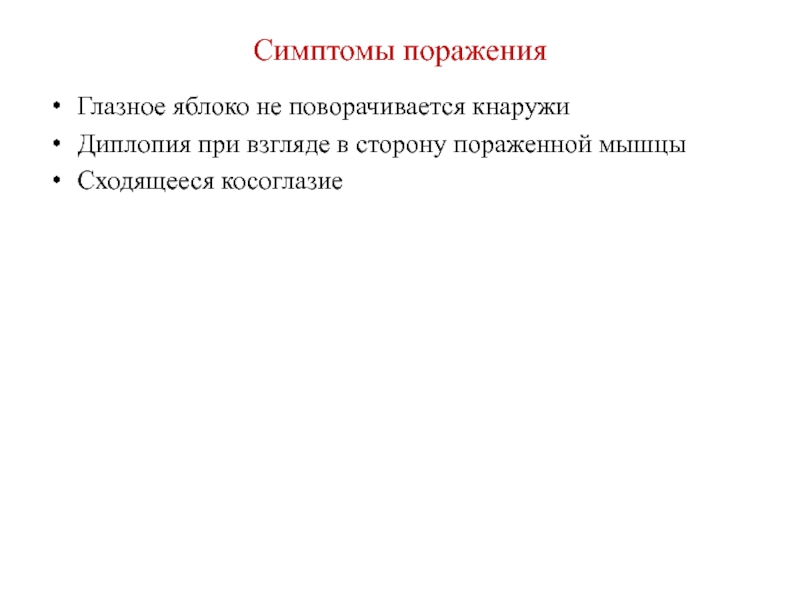 Расходящееся косоглазия (на пораженной стороне глазное яблоко отклонено кнаружи)