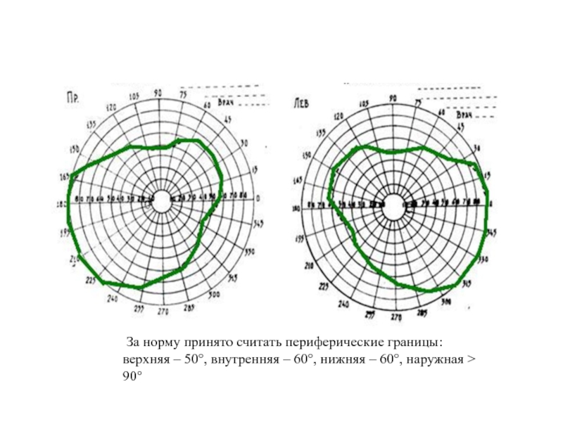 Слайд 26 За норму принято считать периферические границы: верхняя – 50°, внутренняя –