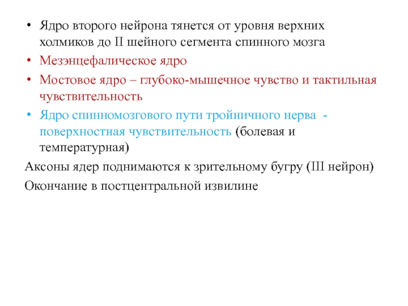 Слайд 57Ядро второго нейрона тянется от уровня верхних холмиков до II шейного