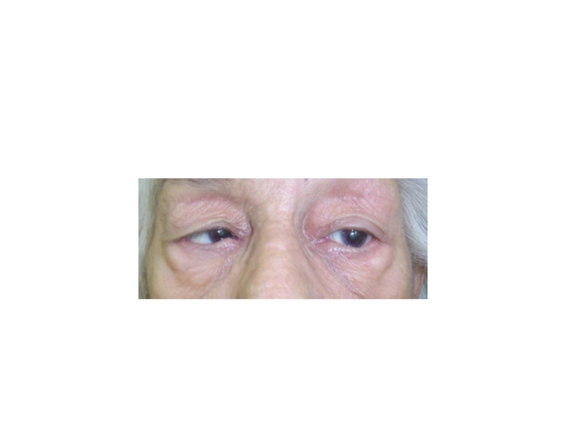 Птоз на своей стороне (поражение мышцы, поднимающей верхнее веко)