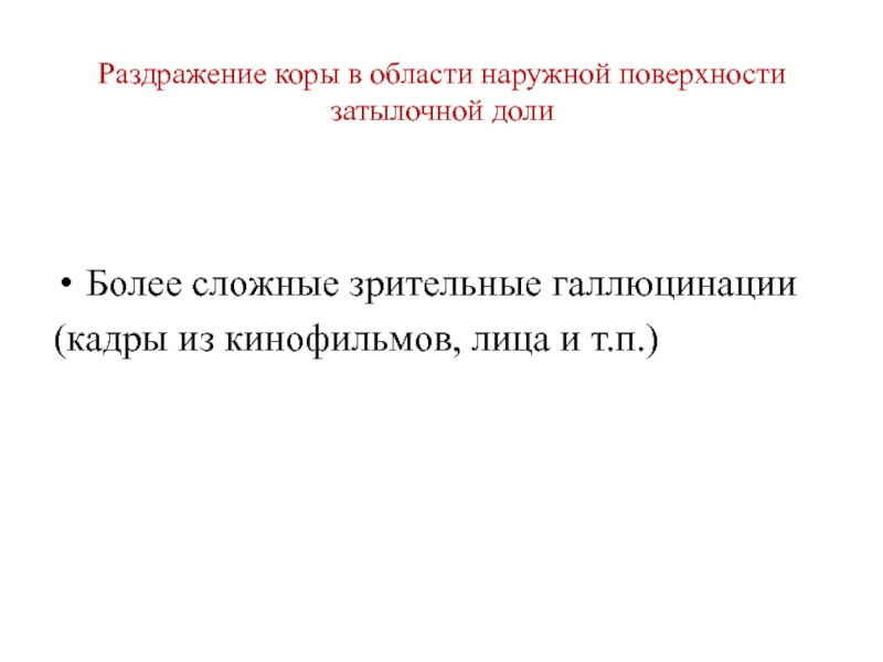 Слайд 23Раздражение коры в области наружной поверхности затылочной доли