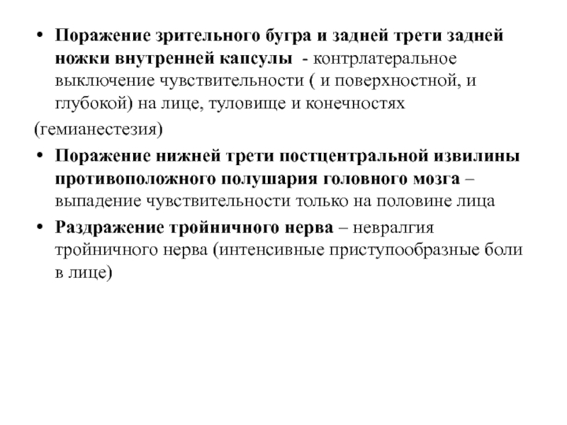 Слайд 66Поражение зрительного бугра и задней трети задней ножки внутренней капсулы -