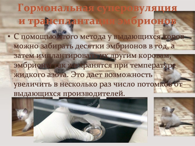 можно забирать десятки эмбрионов в год, а затем имплантировать их другим коровам; эмбрионы так же хранятся при температуре жидкого азота. Это дает возможность увеличить в несколько раз число потомков от выдающихся производителей.