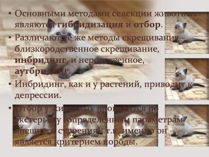 скрещивание - родителей скрещивают с потомством, братьев с сестрами, что помогает получить большее число особей, обладающих нужными свойствами.