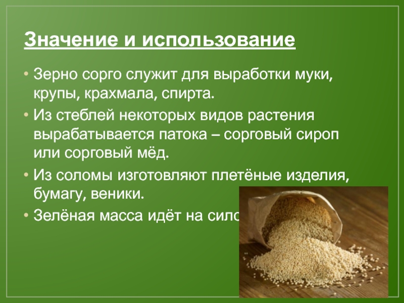 Зерно сорго служит для выработки муки, крупы, крахмала, спирта.