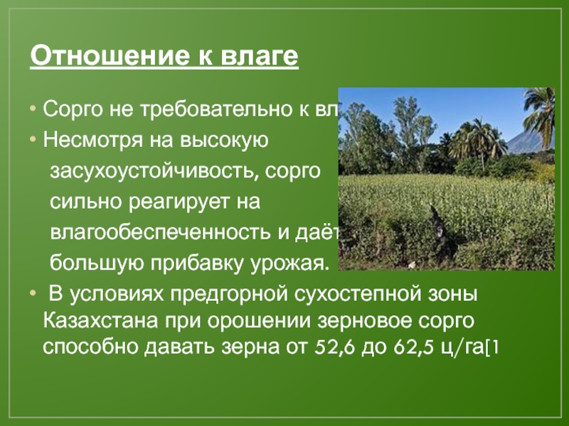 В условиях предгорной сухостепной зоны Казахстана при орошении зерновое сорго способно давать зерна от 52,6 до 62,5 ц/га[1