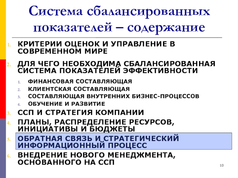 Слайд 10Система сбалансированных показателей – содержание