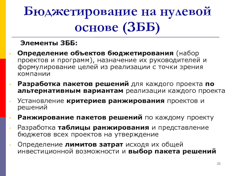 Слайд 21Бюджетирование на нулевой основе (ЗББ)