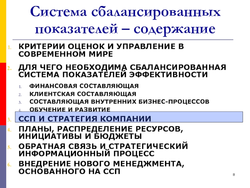 Слайд 8Система сбалансированных показателей – содержание