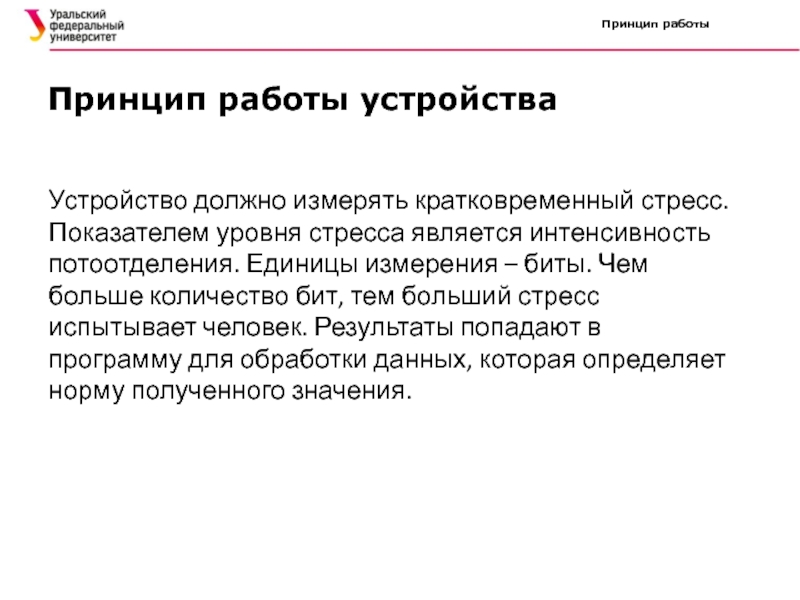 Устройство должно измерять кратковременный стресс. Показателем уровня стресса является интенсивность потоотделения. Единицы измерения – биты. Чем больше количество бит, тем больший стресс испытывает человек. Результаты попадают в программу для обработки данных, которая определяет норму полученного значения.