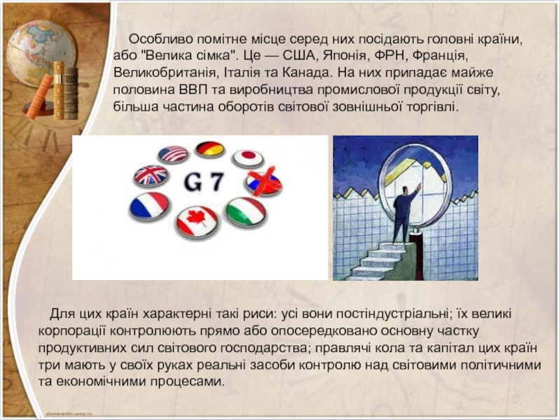 Для цих країн характерні такі риси: усі вони постіндустріальні; їх великі корпорації контролюють прямо або опосередковано основну частку продуктивних сил світового господарства; правлячі кола та капітал цих країн три мають у своїх руках реальні засоби контролю над світовими політичними та економічними процесами.