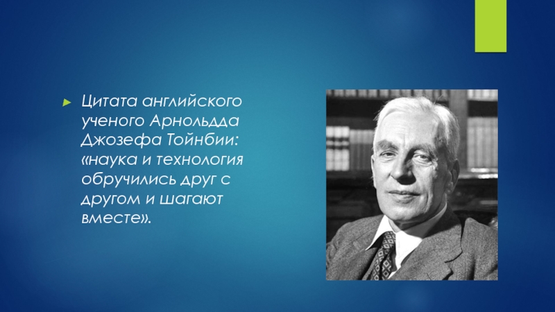 Цитата английского ученого Арнольдда Джозефа Тойнбии: «наука и технология обручились друг с другом