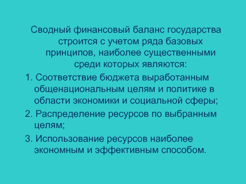 Слайд 4Сводный финансовый баланс государства строится с учетом ряда базовых принципов, наиболее