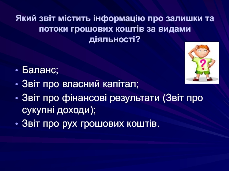 Слайд 23Який звіт містить інформацію про залишки та потоки грошових коштів за