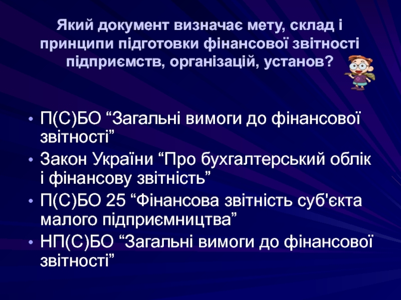 Слайд 27Який документ визначає мету, склад і принципи підготовки фінансової звітності підприємств,