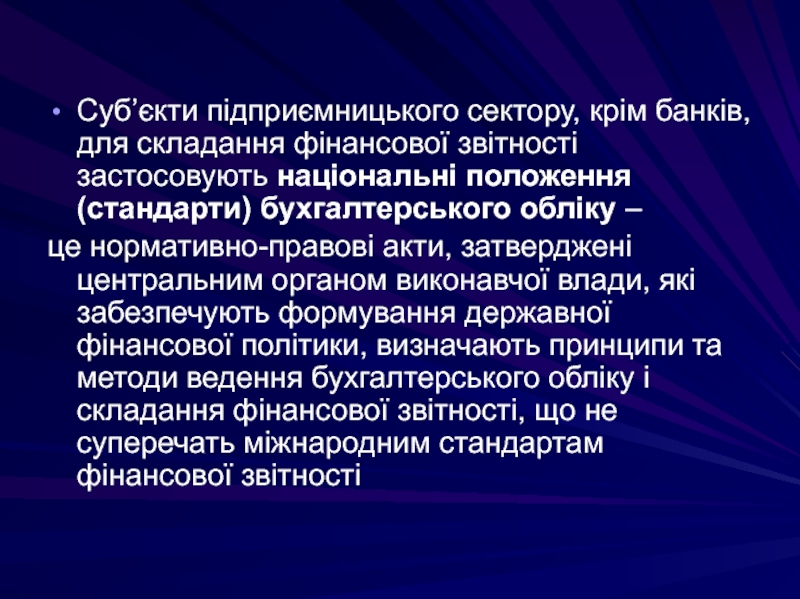 Слайд 8Суб’єкти підприємницького сектору, крім банків, для складання фінансової звітності застосовують національні