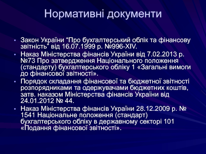 Наказ Міністерства фінансів України від 7.02.2013 р. №73 Про затвердження Національного положення (стандарту) бухгалтерського обліку 1 «Загальні вимоги до фінансової звітності».