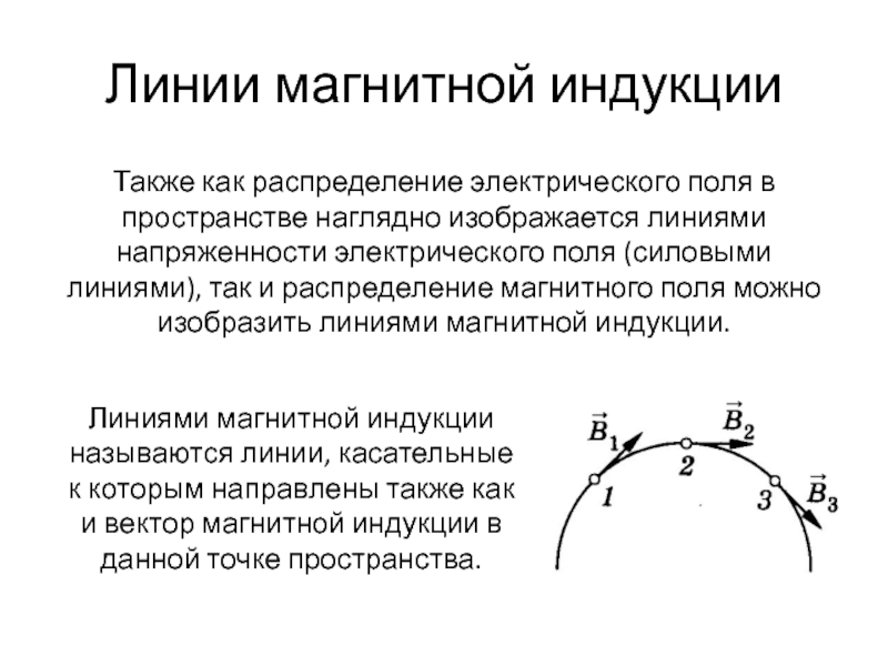Линиями магнитной индукции называются линии, касательные к которым направлены также как и вектор магнитной индукции в данной точке пространства.
