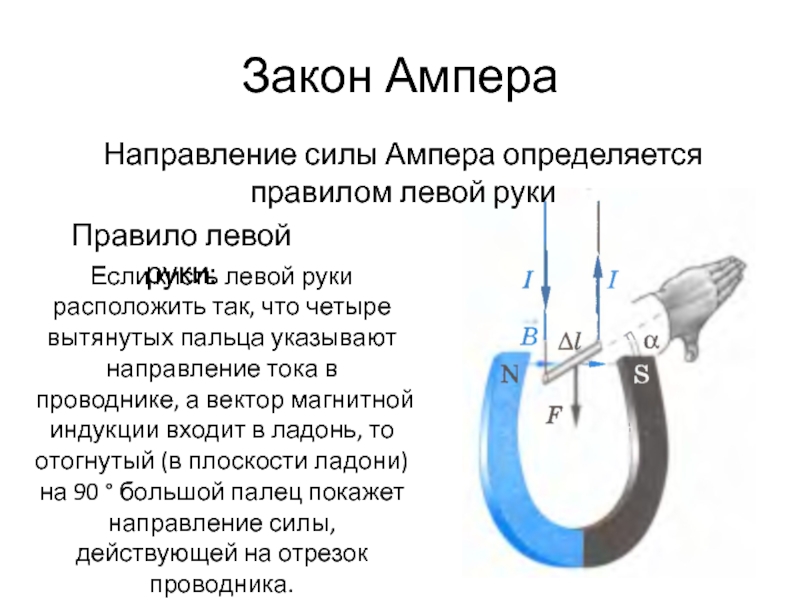Сила, с которой магнитное поле действует на помещенный в него отрезок проводника с током, равна произведению силы тока, модуля вектора магнитной индукции, длины отрезка проводника и синуса угла между направлениями тока и магнитной индукции: