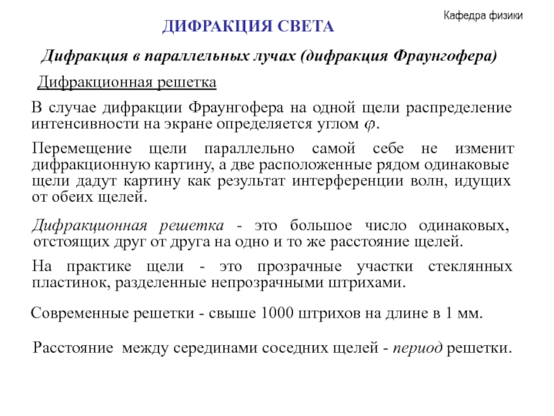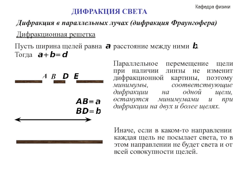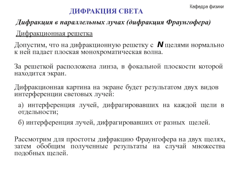 Рассмотрим для простоты дифракцию Фраунгофера на двух щелях, затем обобщим полученные результаты на случай множества подобных щелей.