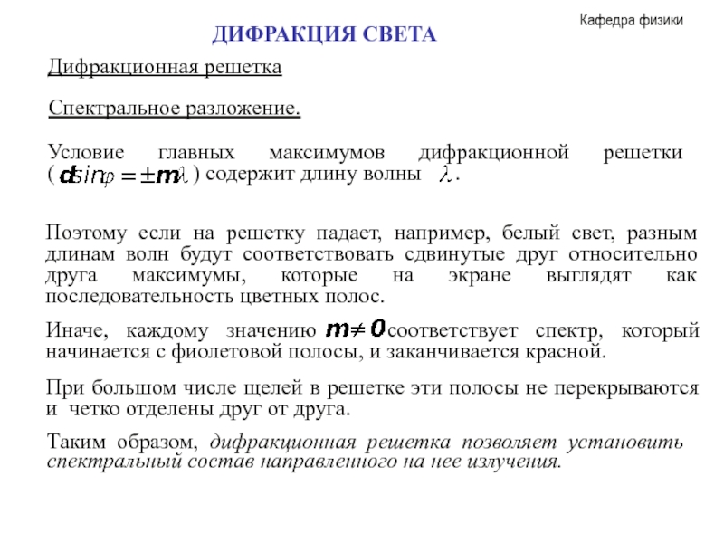 Таким образом, дифракционная решетка позволяет установить спектральный состав направленного на нее излучения.