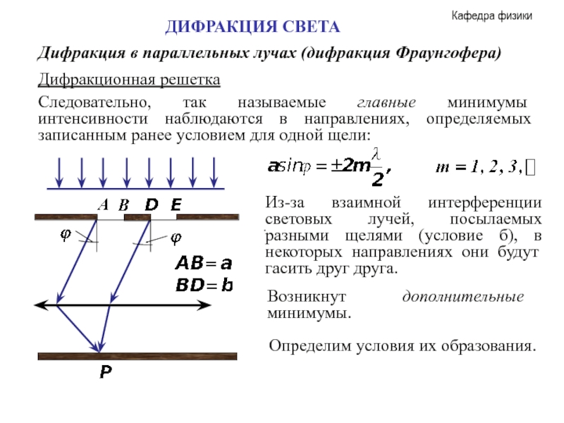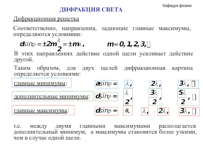 Таким образом, для двух щелей дифракционная картина определяется условиями: