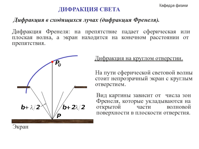 Вид картины зависит от числа зон Френеля, которые укладываются на открытой части волновой поверхности в плоскости отверстия.