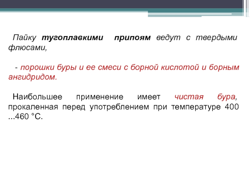Слайд 14Пайку тугоплавкими припоям ведут с твердыми флюсами,