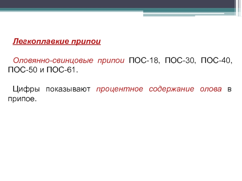Оловянно-свинцовые припои ПОС-18, ПОС-30, ПОС-40, ПОС-50 и ПОС-61.