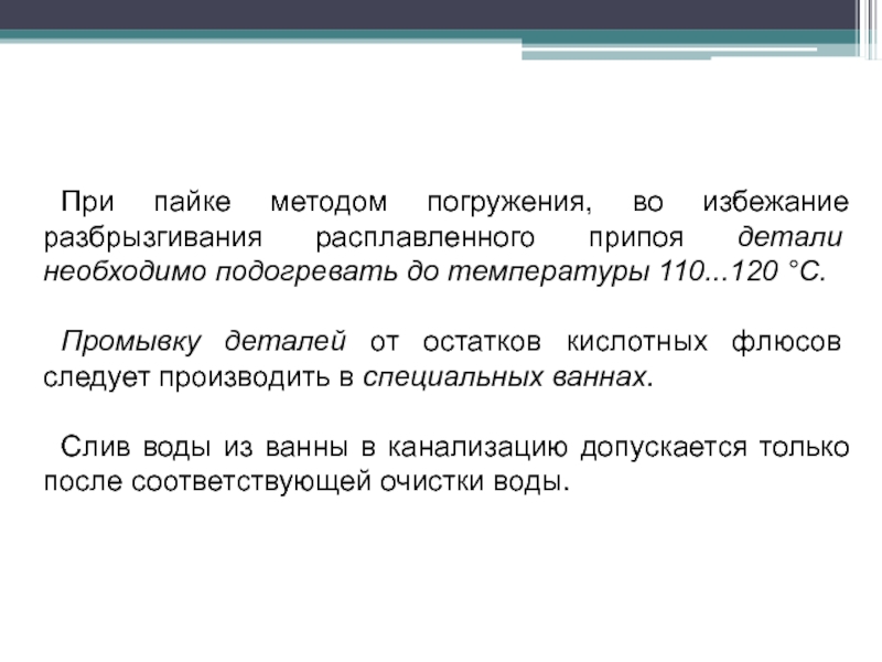 Слайд 19При пайке методом погружения, во избежание разбрызгивания расплавленного припоя детали необходимо