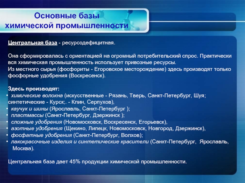 Тонкая химия: фармацевтика (производство лекарственных веществ и препаратов); фотохимия (производство разнообразных фотоматериалов); бытовая химия, парфюмерия