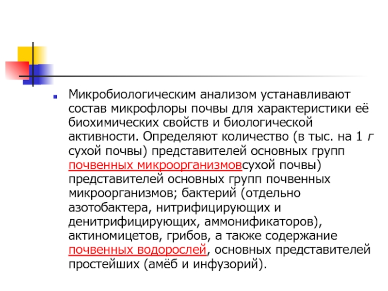 и биологической активности. Определяют количество (в тыс. на 1 г сухой почвы) представителей основных групп почвенных микроорганизмовсухой почвы) представителей основных групп почвенных микроорганизмов; бактерий (отдельно азотобактера, нитрифицирующих и денитрифицирующих, аммонификаторов), актиномицетов, грибов, а также содержание почвенных водорослей, основных представителей простейших (амёб и инфузорий).