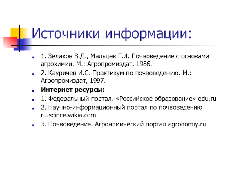 1. Зеликов В.Д., Мальцев Г.И. Почвоведение с основами агрохимии. М.: