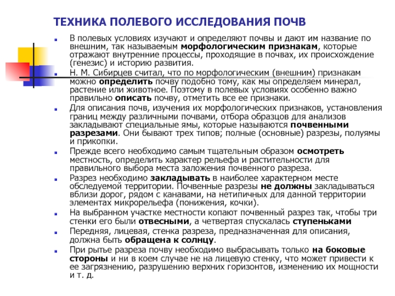 Н. М. Сибирцев считал, что по морфологическим (внешним) признакам можно определить почву подобно тому, как мы определяем минерал, растение или животное. Поэтому в полевых условиях особенно важно правильно описать почву, отметить все ее признаки.