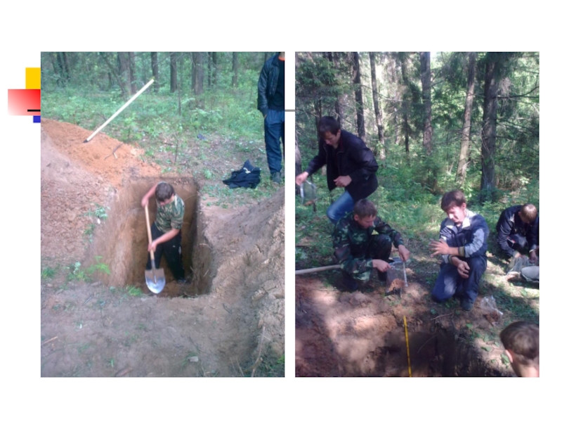 На выбранном участке местности копают почвенный разрез так, чтобы три стенки его были отвесными, а четвертая спускалась ступеньками