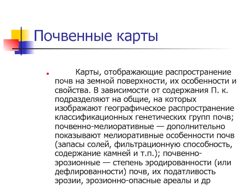 свойства. В зависимости от содержания П. к. подразделяют на общие, на которых изображают географическое распространение классификационных генетических групп почв; почвенно-мелиоративные — дополнительно показывают мелиоративные особенности почв (запасы солей, фильтрационную способность, содержание камней и т.п.); почвенно-эрозионные — степень эродированности (или дефлированности) почв, их податливость эрозии, эрозионно-опасные ареалы и др