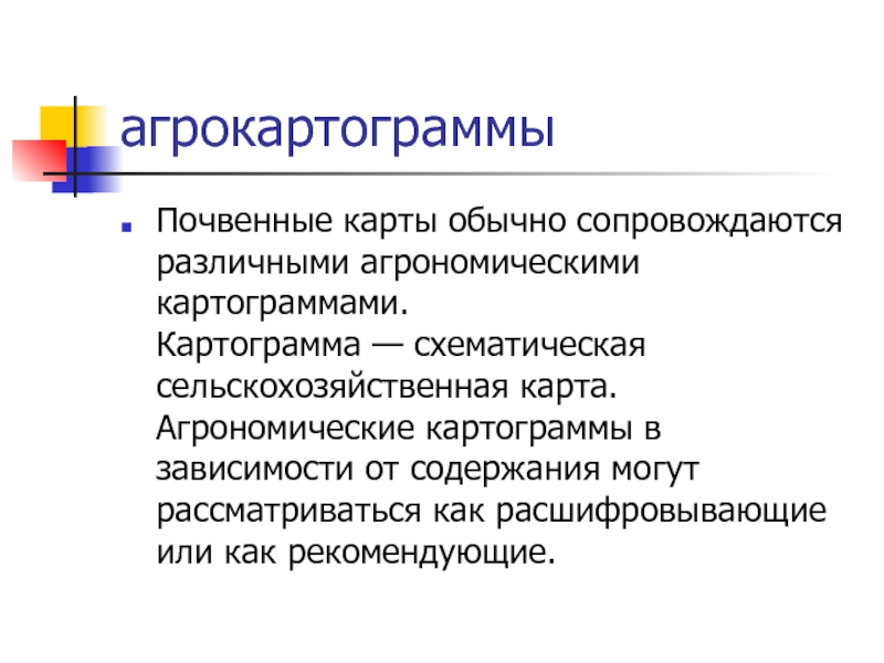 карта. Агрономические картограммы в зависимости от содержания могут рассматриваться как расшифровывающие или как рекомендующие.