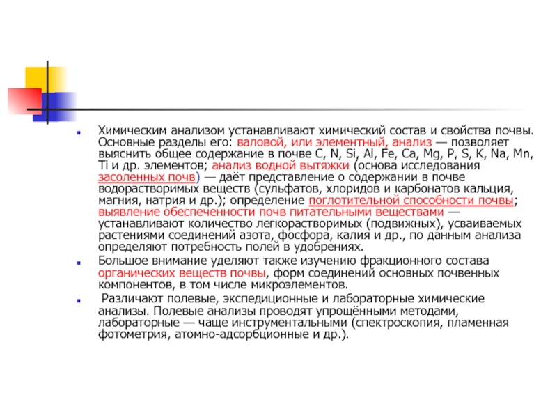 Химическим анализом устанавливают химический состав и свойства почвы. Основные разделы его: