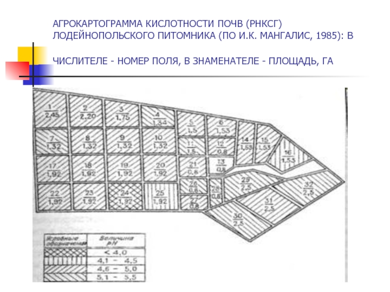 Слайд 23АГРОКАРТОГРАММА КИСЛОТНОСТИ ПОЧВ (РНКСГ) ЛОДЕЙНОПОЛЬСКОГО ПИТОМНИКА (ПО И.К. МАНГАЛИС, 1985): В