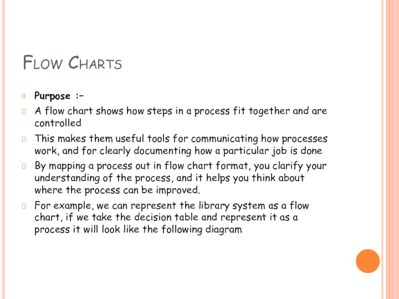For example, we can represent the library system as a flow chart, if we take the decision table and represent it as a process it will look like the following diagram
