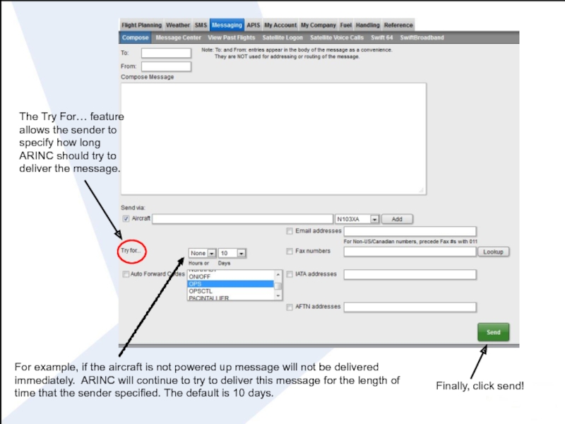 The Try For… feature allows the sender to specify how long ARINC should try to deliver the message.