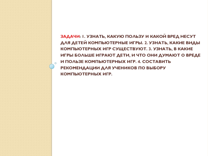 КОМПЬЮТЕРНЫЕ ИГРЫ. 2. УЗНАТЬ, КАКИЕ ВИДЫ КОМПЬЮТЕРНЫХ ИГР СУЩЕСТВУЮТ. 3. УЗНАТЬ, В КАКИЕ ИГРЫ БОЛЬШЕ ИГРАЮТ ДЕТИ, И ЧТО ОНИ ДУМАЮТ О ВРЕДЕ И ПОЛЬЗЕ КОМПЬЮТЕРНЫХ ИГР. 4. СОСТАВИТЬ РЕКОМЕНДАЦИИ ДЛЯ УЧЕНИКОВ ПО ВЫБОРУ КОМПЬЮТЕРНЫХ ИГР.