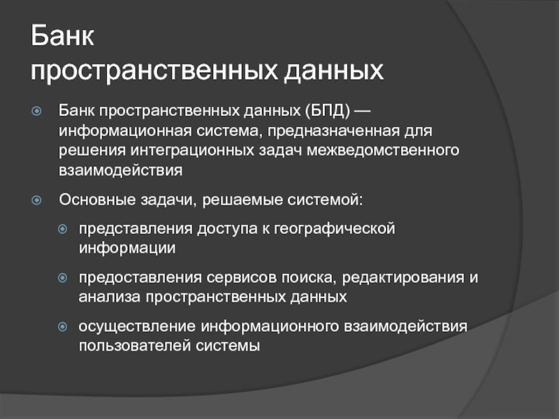 Банк пространственных данных (БПД) —информационная система, предназначенная для решения