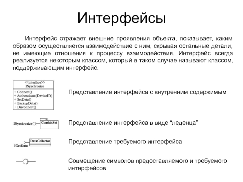 ним, скрывая остальные детали, не имеющие отношения к процессу взаимодействия. Интерфейс всегда реализуется некоторым классом, который в таком случае называют классом, поддерживающим интерфейс.