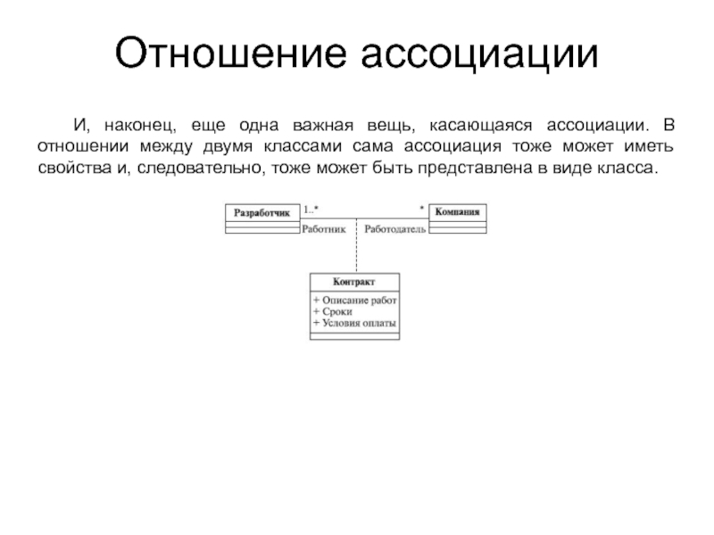 между двумя классами сама ассоциация тоже может иметь свойства и, следовательно, тоже может быть представлена в виде класса.